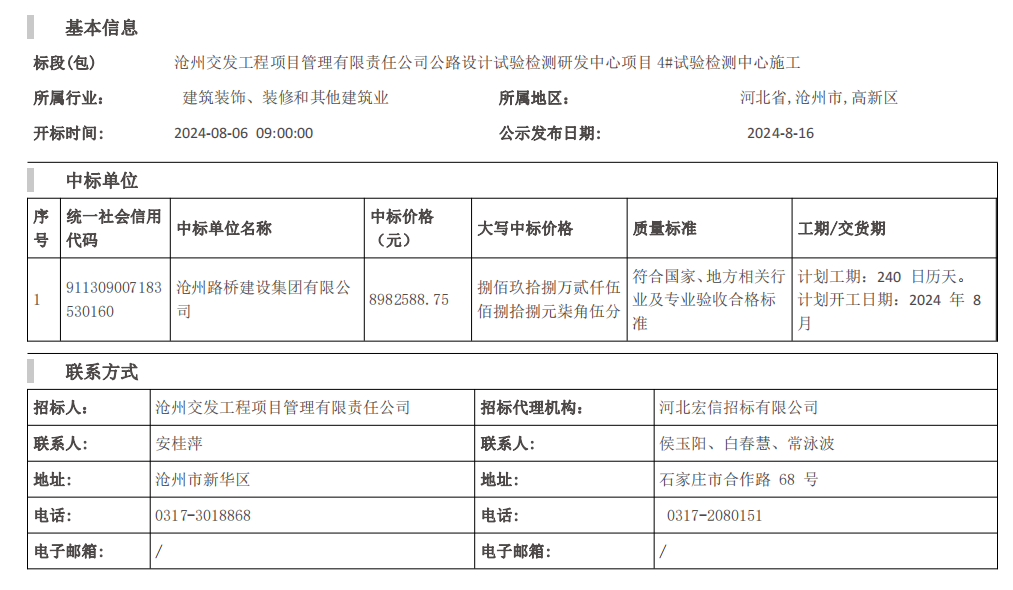 沧州交发工程项目管理有限责任公司公路设计试验检测研发中心项目 4#试验检测 中心施工中标结果公示